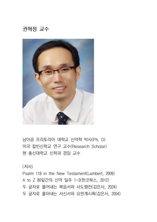 신약신학 분류 필진 작성자 정보 최고관리자 작성 작성일 2025.09.05 19:33 컨텐츠 정보 140 조회 0 추천 0 비추천 목록 본문 권혁정 총신대학교 겸임 교수 [이 게시물은 최고관리자님에 의해 2025-09-18 00:26:08 신학에서 이동 됨] 0 추천 0 비추천 SNS 공유 관련자료 이전 두 글자 요한복음 연재(4): 와서 보면 내가 누군지 알지롱! 작성일 2025.09.18 07:13 다음 두 글자 요한복음 연재(3): 핵폭탄 하나 투척할게요! 작성일 2025.09.15 01:02 댓글 0 등록된 댓글이 없습니다. 로그인한 회원만 댓글 등록이 가능합니다. 목록