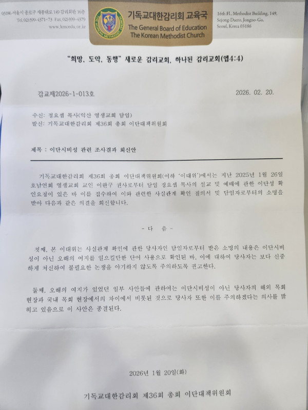 필자는 익산 영생교회에서 권사로 섬기며 목격한 정요셉 목사의 비성경적 설교와 목회 행태에 대해 이대위에 공식적인 이단성 심사를 청원하였다. 그 결과 돌아온 것은 진지한 신학적 검토가 아니라, 명백한 이단적 요소들을 '단어 선택의 실수'와 '상황화 신학'이라는 궤변으로 덮어버린 무성의한 회신이었다. 감리교 본부가 이 평결을 방치한다면, 이는 교단 전체의 신학적 정체성을 포기하는 행위가 된다.