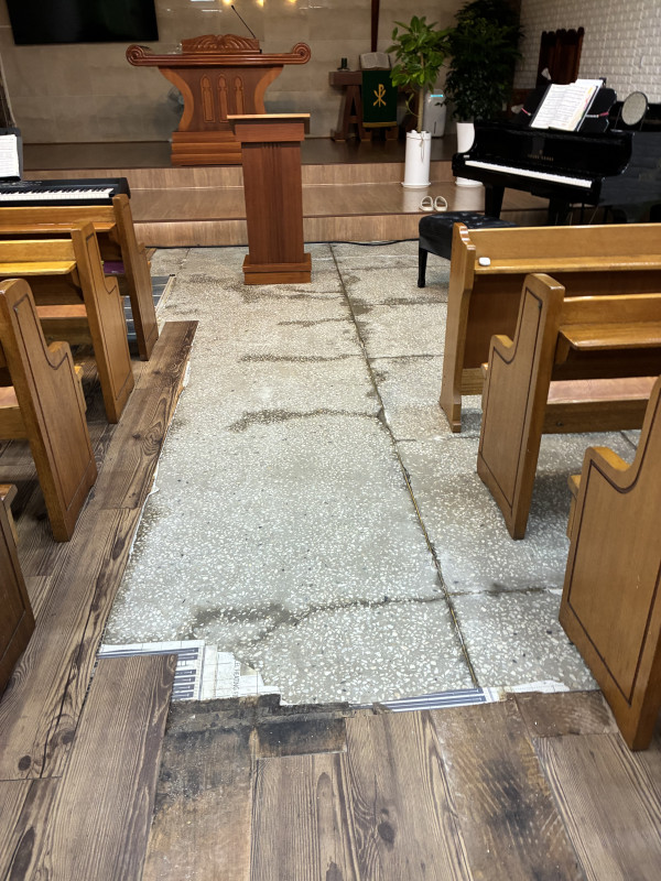 위 사진은 발행인이 담임으로 섬기고 있는 원천교회의 현재 상황이다. 지난 늦가을 내린 비로 지하에 위치하고 있는 예배당이 벽의 누수로 인해 바닥까지 스며들어 장판을 들춰내고 아직도 보수를 하지 못한 상태다. 입법의회의 날짜는 다가오고 교회의 누수상황도 심각한데 무엇이 더 중요한지 판단을 할 때, 눈에 보이는 것보다 더 중요한 입법의회에서 통과되면 안 되는 일이 더욱 중요하다고 판단하였기에, 또한 성전 바닥은 물이 어디까지 스며들었는지 더 살펴야 할 것이기에, 성도들에게 부담을 지우지 않고 최소한의 경비로 해결해 보려는 이러저러한 이유로 지금과 같은 상태가 된 것이다.