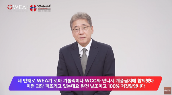- 주연종 목사 주장: “WEA가 로마 가톨릭이나 WCC와 만나서 개종 금지에 합의했다 … 완전 날조이고 100% 거짓말입니다 … ‘강제 개종 금지’를 가지고 ‘강제’자를 떼버리고 개정금지 합의했다는 것은 완전 왜곡이고 날조고 본질을 변질시킨 것입니다.”
